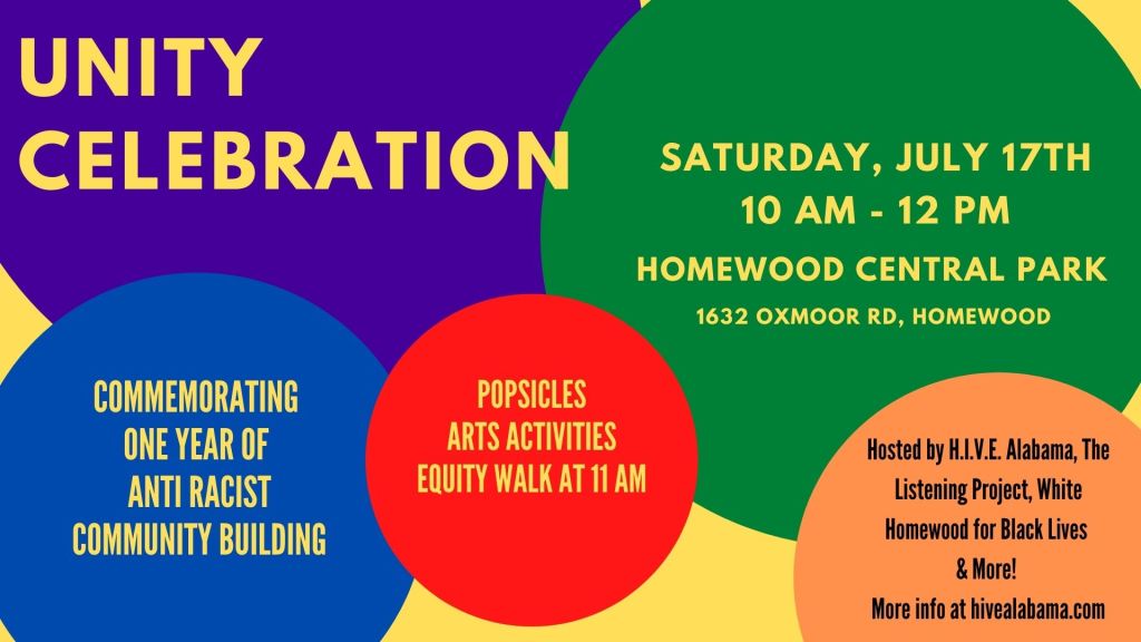 Join us for Homewood’s first Unity Celebration on Saturday, July 17th from 10 a.m. – 12 p.m. sponsored by H.I.V.E. Alabama, The Listening Project, White Homewood for Black Lives, and more! This celebration marks 1 year of equity walks in Homewood and we look forward to celebrating with you. Join us for popsicles, family friendly activities, and a community equity walk at 11 a.m. We will have literature about our groups as well as other organizations working towards racial equity in our area.
