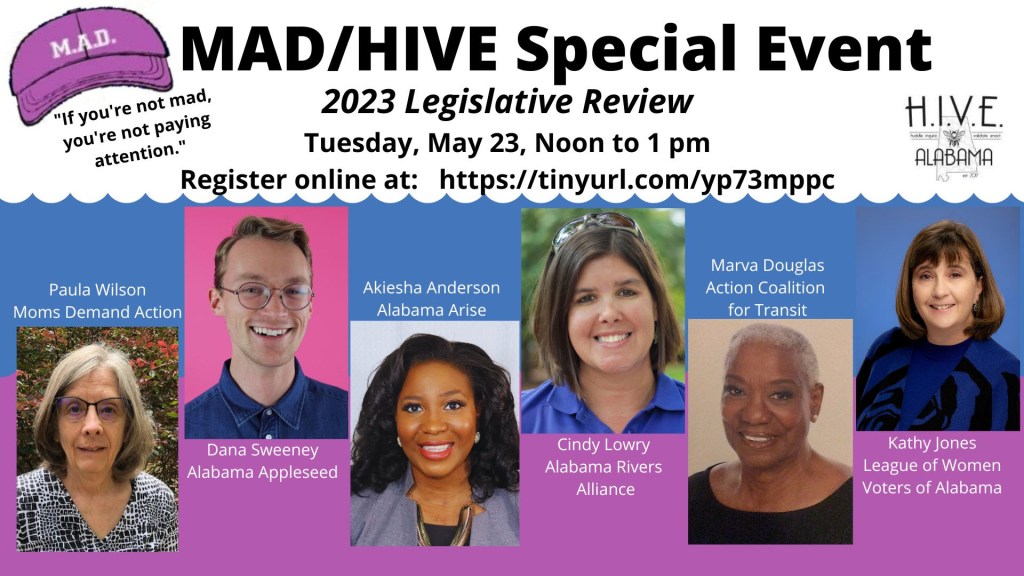 Join H.I.V.E. and besties MAD? Make a Difference Alabama for a virtual Legislative Review Tuesday, May 23 from 12-1 p.m.