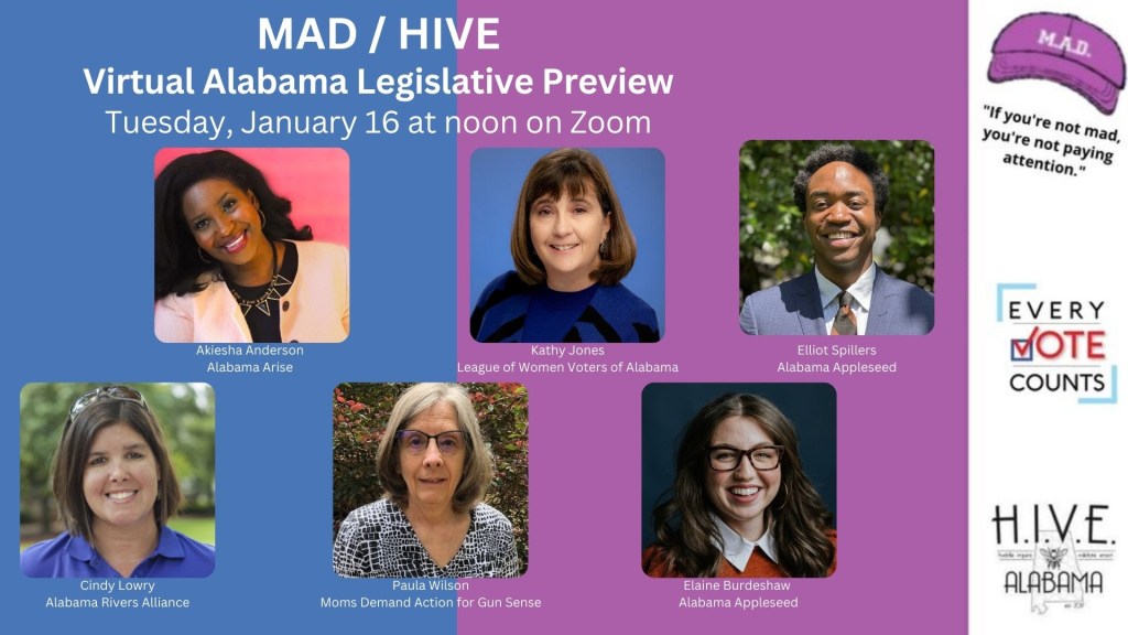 It’s a presidential election year, and state lawmakers face political headwinds while trying to conduct business. As usual, bad bills will compete with good ones. To stay abreast of key issues, join us and our amazing friends at MAD?Make A Difference for a virtual Legislative Preview: Making Montgomery Work next Tuesday, January 16th from 12 to 1 p.m. We will hear from six amazing policy advocates with these leading not-for-profit organizations: